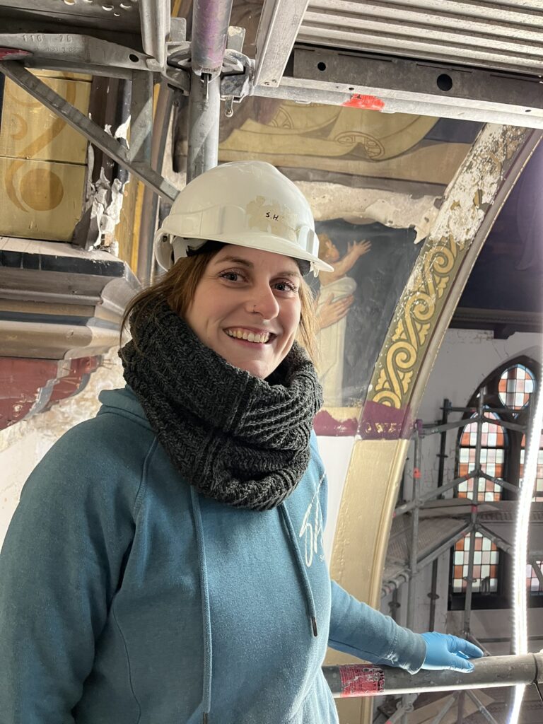 Sien Hendriks is restaurator, conservator en onderzoeker en is door MWPO betrokken bij het uitvoeren van het kleurhistorisch onderzoek. We hebben met haar afgesproken in de kapel. “Het doel van het onderzoek is om te achterhalen welke kleuren als eerste zijn toegepast en welke kleuren werden gebruikt in latere periodes. Ook moet uit onderzoek blijken of er bepaalde decoratieve motieven of sjablonen zijn toegepast. Hiermee kunnen we de informatie van de afwerkingsfases documenteren. Zo net aan het begin van de transformatie is dit hét moment om informatie te achterhalen en te borgen: zo bewaren we een belangrijk stuk geschiedenis. Het tweede doel voor MWPO is heel concreet; we willen waar mogelijk de originele kleuren terugbrengen in het interieur, zoals op deuren, kozijnen, vaste kasten, balustrades, muren en plafonds. De resultaten van het onderzoek delen we dan ook met de architect en interieurarchitect, zodat zij mede op basis daarvan kunnen bepalen welke kleuren worden teruggebracht op de interieur elementen.” Het kleurhistorisch onderzoek aan de buitenzijde is uitgevoerd door de Bianca Eikhoudt van de gemeente ‘s-Hertogenbosch. “Daaruit bleek dat er veel tinten oker zijn toegepast. Het warme geel is een veel voorkomende kleur voor historische gebouwen in ‘s-Hertogenbosch; het is een kleur die niet snel veroudert, het verkleurd niet snel door UV stralen. En niet onbelangrijk; het was vroeger een betaalbare kleur” aldus Diane van der Heijden.