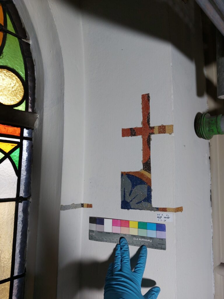 Hoe gaat zo’n kleurhistorisch onderzoek in zijn werk? Sien vertelt: “Ik begin met uitgebreid onderzoek in bijvoorbeeld het stadsarchief ’s Hertogenbosch, het Brabants Historisch Informatie Centrum en de beeldbank van de Rijksdienst voor Cultureel Erfgoed. Daarna kijk en voel ik vooral; hoe is de structuur, de glans en de hardheid van de verflagen? Door middel van belichting zie ik verschillen in reliëf op de muur, die kunnen duiden op lijnen of patronen. Dat is vaak de aanleiding om verder te onderzoeken.” Met een scalpel legt Sien voorzichtig de verschillende lagen vrij. Deze stratigrafieën ofwel kleurentrapjes, zien we op verschillende plekken terug in het Zusterhuis en de kapel. Of ze nog verrassingen tegenkwam? “Absoluut. In de ziekenboeg, het linkerdeel van het Zusterhuis met een lagere monumentale waarde, kwamen we marmerimitaties tegen in de lambrisering. Op deze plek had ik het juist niet verwacht, want normaliter worden decoraties vooral toegepast in de ‘rijkere’ delen van een gebouw, zoals hier bijvoorbeeld in de kloostervleugel of de kapel.”